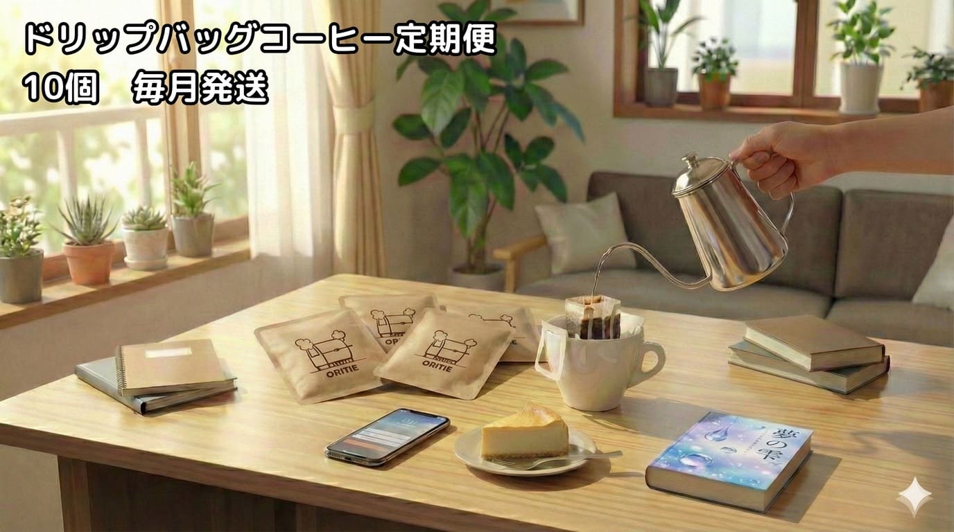 【ドリップバッグ10個】オリティエで焙煎し、手作業で製造しているドリップバッグコーヒー。10個を毎月発送します。10種類の味わいが楽しめます。1個あたり12gの粉を使用し中挽きでパッケージ。通常のドリップコーヒーと遜色ない、本格コーヒーが手軽に味わえます。