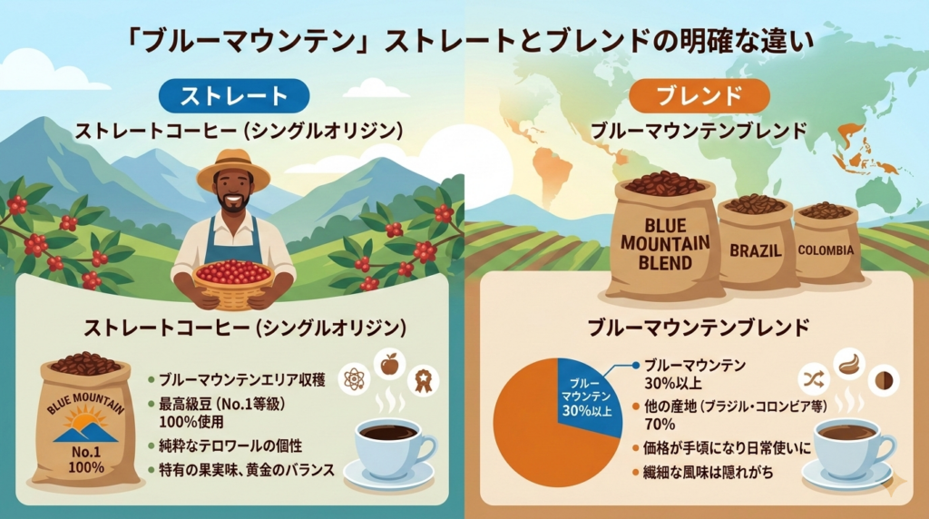 一方、「ブルーマウンテンブレンド」は、ブラジルやコロンビアなど他の産地の豆をベースに、ブルーマウンテンを配合したものです。日本のルールでは、ブレンド名にその豆の名前を使う場合、重量比で30%以上使用すれば良いことになっています。つまり、残りの70%は別の豆です。価格が手頃になり日常使いには適していますが、ブルーマウンテン本来の繊細な風味は他の豆に隠れてしまうため、真の魅力を知る目的であればストレートをおすすめします。