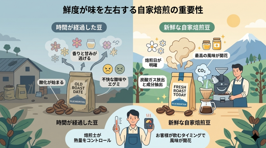 コーヒー豆は生鮮食品と同じです。焙煎した直後から酸化が始まり、ブルーマウンテン特有の「花のような香り」や「繊細な甘み」は、時間とともに空気中へ逃げていってしまいます。また、豆の油分が酸化すると、不快な酸味やエグミに変わってしまいます。
