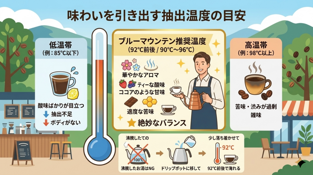プロの焙煎士として推奨するブルーマウンテンの最適な抽出温度は、「92℃前後(90℃〜96℃の範囲)」です。この絶妙な温度帯こそが、華やかなアロマを揮発させつつ、フルーティーな酸味とココアのような甘味、そして適度な苦味を最もバランス良く引き出す臨界点となります。沸騰したてのお湯を使うのではなく、ドリップポットに移して少し落ち着かせた温度で淹れることを心がけてください。