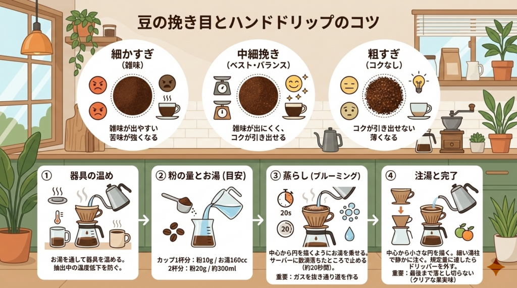 豆の挽き目は、標準的な「中細挽き」がベストです。細かすぎると雑味が出やすく、粗すぎるとコクが引き出せません。以下に、ご自宅で実践できるプロのドリップ手順をご紹介します。