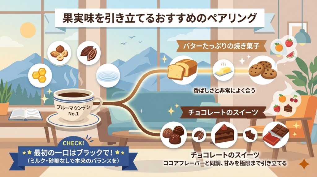 ブルーマウンテンは、ナッツやココアのような香ばしい甘みと、滑らかな質感を持っています。そのため、バターをたっぷりと使った焼き菓子(パウンドケーキやコーヒークッキー)の香ばしさと非常によく合います。また、チョコレートを使ったスイーツは、ブルーマウンテンのココアフレーバーと芳香成分が同調し、互いの甘みを極限まで引き立ててくれます。 休日のリラックスタイムに、お気に入りのスイーツとともに極上のコーヒーブレイクを楽しんでみてはいかがでしょうか。ただし、最高等級「No.1」の繊細なバランスを知るために、最初の一口はぜひミルクや砂糖を入れず「ブラック」で味わってみてください。