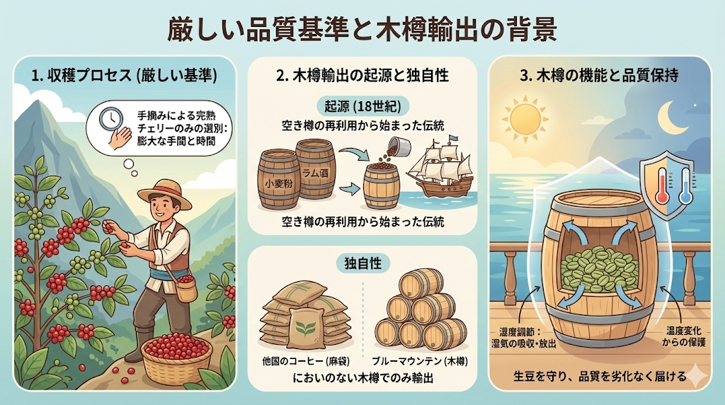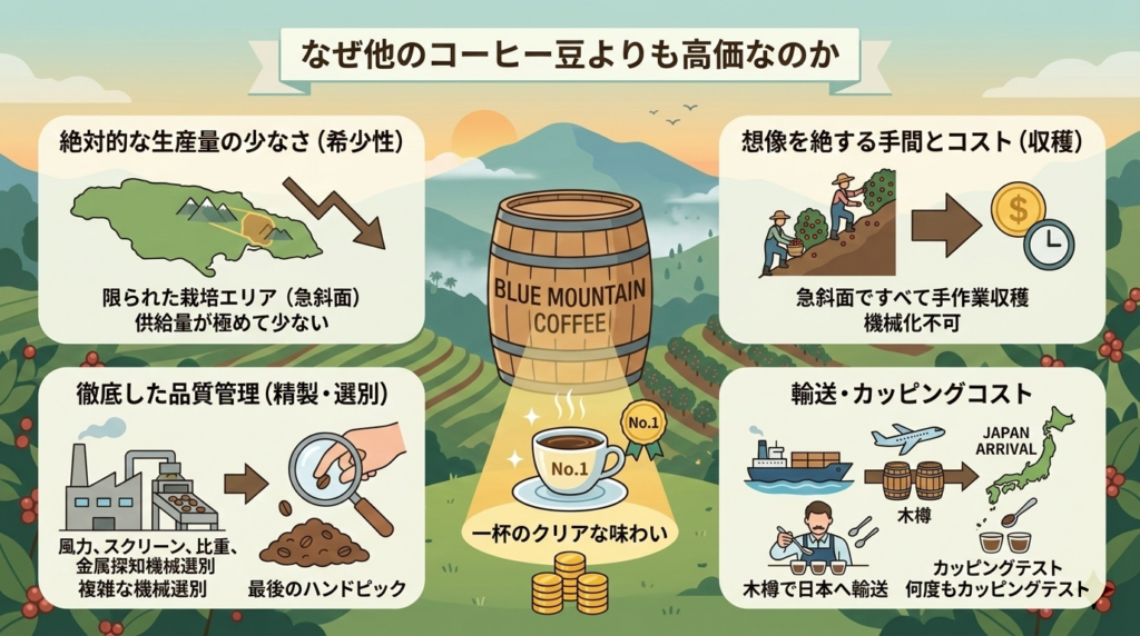 ブルーマウンテンの価格が際立って高い理由は、「絶対的な生産量の少なさ」と「想像を絶する手間とコスト」にあります。 限られた斜面でしか栽培できないため供給量が少なく、斜面が急すぎて機械が入れないため、収穫はすべて手作業です。さらに、精製から乾燥、機械選別(風力、スクリーン、比重、金属探知)を経て、最後は人の目と手による入念なハンドピックが行われます。日本に到着してからも何度もカッピングテストが行われ、木樽に入れて輸送されるコストも上乗せされます。これらすべての過酷な工程と徹底した品質管理が、あの一杯のクリアな味わいを守るために費やされているのです。