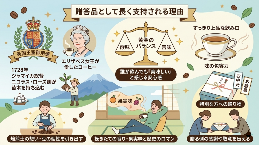 日本では古くから、ブルーマウンテンはお中元やお歳暮、特別な方への贈り物として絶対的な地位を築いてきました。その背景には、1728年に当時のジャマイカ総督ニコラス・ローズ卿がコーヒーの苗を持ち込んだという歴史があり、「英国王室御用達」「エリザベス女王が愛したコーヒー」といった気品あふれるストーリーが広く知れ渡ったことが挙げられます。