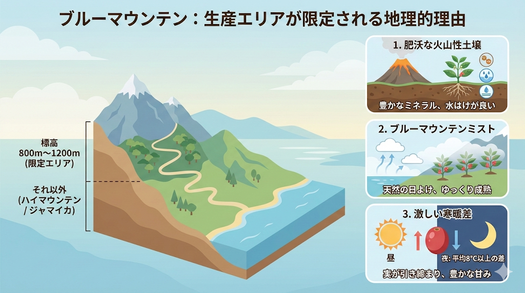 コーヒー豆の品質は、それが育つ土地の環境(テロワール)によって決定づけられます。ブルーマウンテンが世界最高峰の評価を得ている裏には、決して他国では再現できない奇跡的な自然条件と、国を挙げた徹底的な品質管理が存在しています。