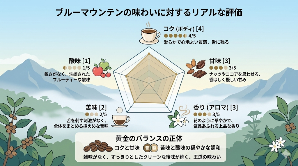 実際のカッピング(風味評価)において、ブルーマウンテンはどのように評価されているのでしょうか。専門家によるブルーマウンテン(最高等級No.1 ウォッシュド)の風味の5段階評価は、以下の表のようになります。