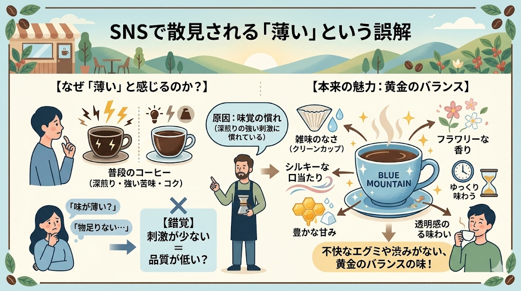 これほどまでに評価が高い一方で、SNSなどでは「高かったのに味が薄く感じた」「物足りない」という声を見かけることがあります。焙煎士の視点から申し上げますと、これはブルーマウンテンの品質が低いからではなく、現代のコーヒー文化における「味覚の慣れ」が関係しています。
