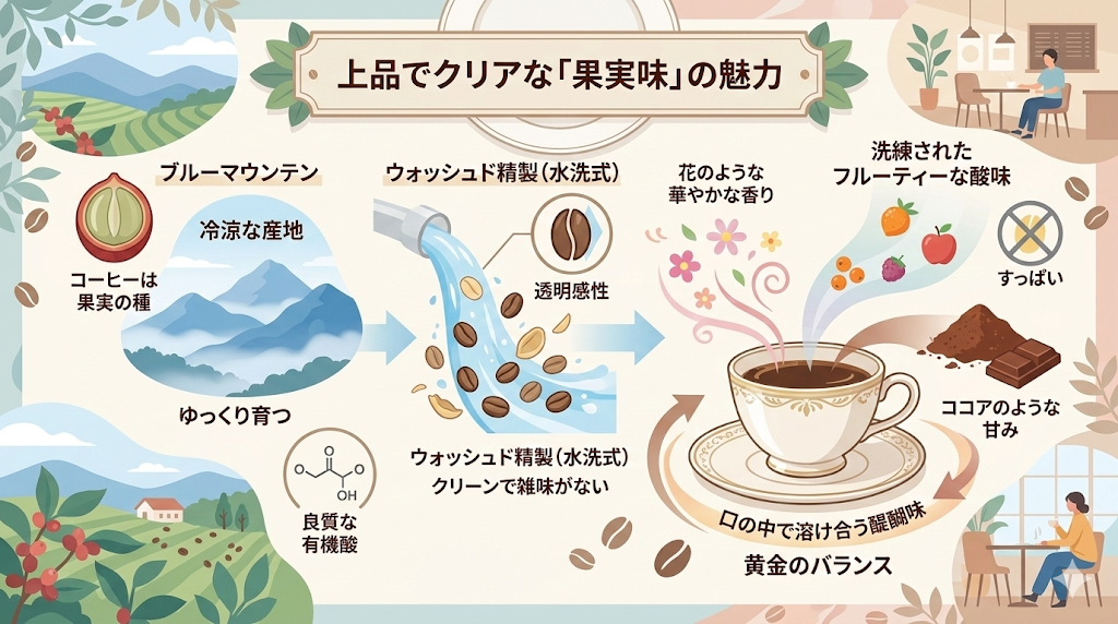 コーヒーは果実の種を焙煎した飲み物であり、本来はフルーツとしての酸味を持っています。ブルーマウンテンの酸味は、決して「すっぱい」と顔をしかめるようなものではなく、上品でクリアな「果実味」として表現されます。