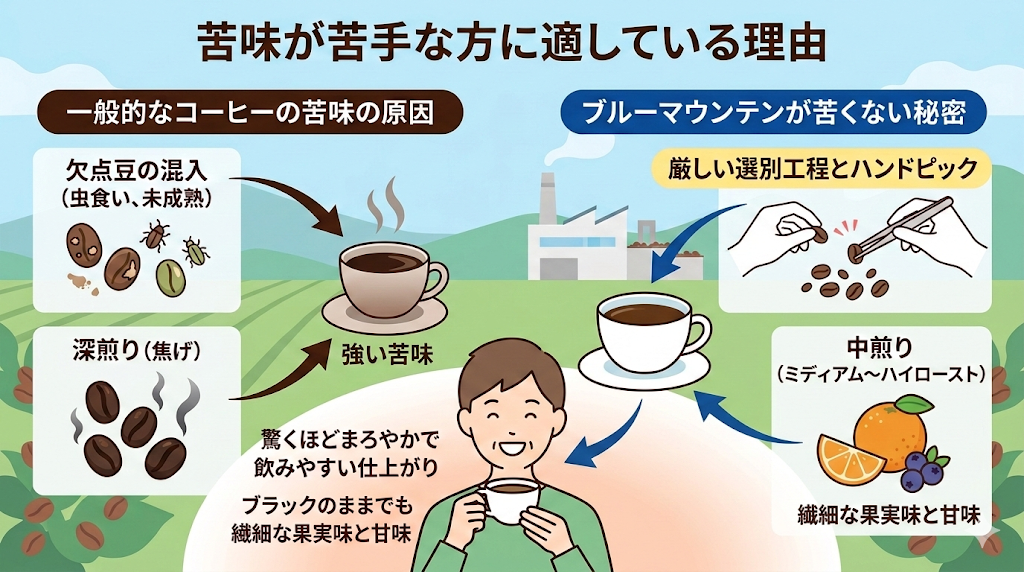 「コーヒーの苦味がどうしても苦手」というお客様に、私が自信を持っておすすめするのがブルーマウンテンです。コーヒーの強い苦味は、豆の成分が深く焙煎されること(焦げ)や、欠点豆(虫食い豆や未成熟豆)が混入することによって生じます。