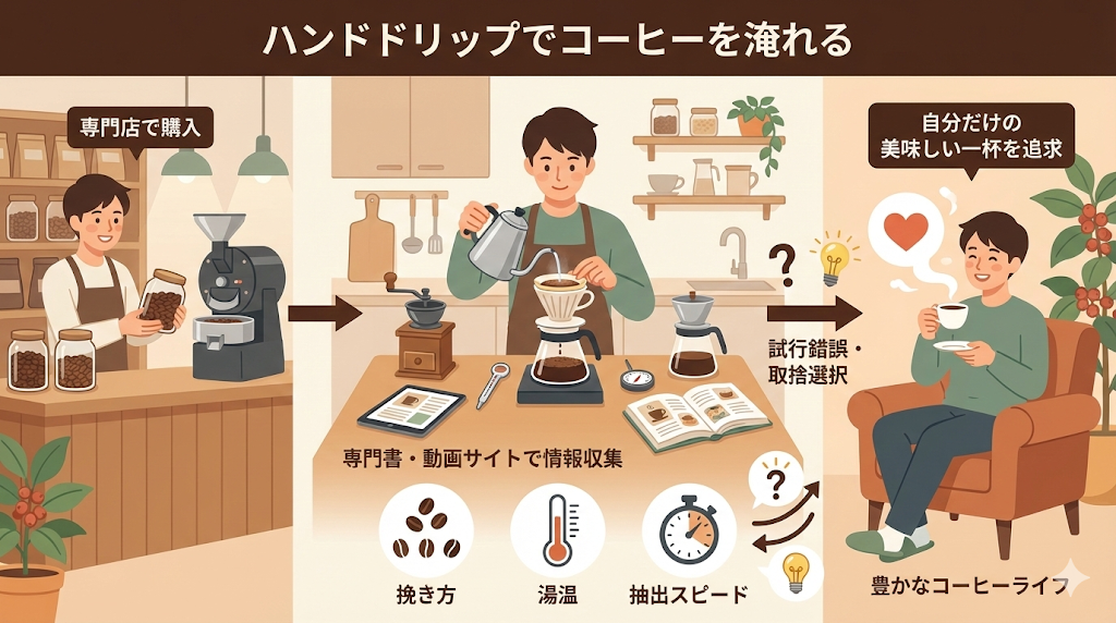 数ある淹れ方の情報を試行錯誤しながら取捨選択し、自分だけの美味しい一杯を追求する過程こそが、コーヒーを趣味とする大きな喜びの一つになります。この楽しみは、手軽な缶コーヒーでは決して味わえません。コーヒー豆の挽き方や湯温、抽出スピードなど、小さな違いが風味に変化をもたらします。自分好みの味わいを模索し、完成させる時間そのものが、豊かなコーヒーライフを彩る要素となるでしょう。
