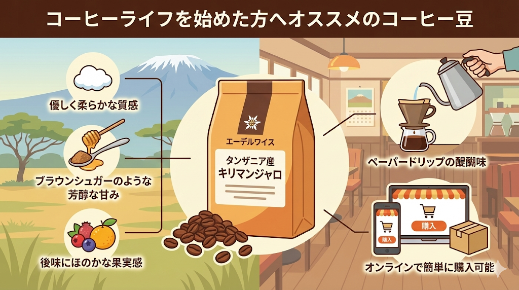 さて、コラムの結びとして、おすすめのコーヒー豆をご紹介します。それは、タンザニアで生産されている「エーデルワイス」という名の銘柄です。この銘柄は、通称キリマンジャロとして昭和世代から長く日本で愛されてきました。優しく柔らかな質感の味わいが特徴で、ブラウンシュガーのような芳醇な甘みが感じられます。後味には、ほのかに果実感が現れることがあり、ペーパードリップの醍醐味を存分に楽しめるコーヒー豆です。以下のURLから簡単に購入し、ご自宅で試すことができます。ぜひ一度、この伝統的な味わいを体験してください。