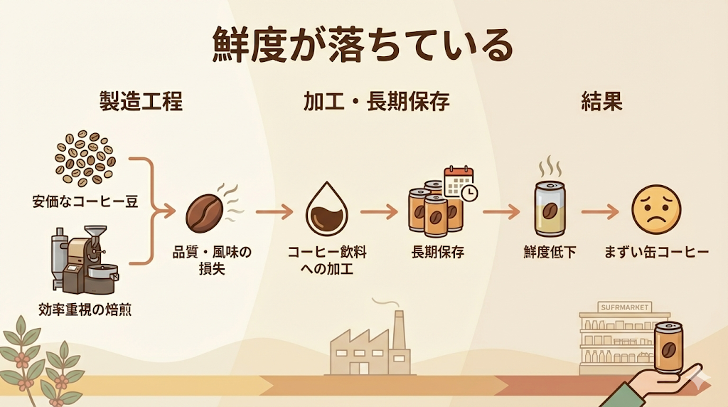 缶コーヒーの価格を抑えるためには、安価なコーヒー豆の使用が不可欠です。そのため、製造コストを低く保つために、グレードの低いコーヒー豆が選ばれる傾向にあります。また、大量生産においては、低品質の豆を効率よく手間をかけずに焙煎することが求められます。結果として、コーヒー豆の段階で本来持っているべき品質や風味が損なわれてしまうのです。