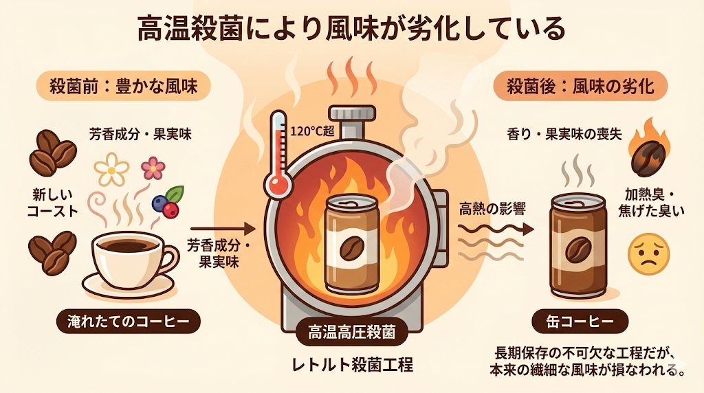 缶コーヒーは、長期保存を実現するために、内容物を缶に詰めた後、120℃を超える高温で短時間殺菌されています。このレトルト殺菌(高温高圧殺菌)の工程が、コーヒーの風味に大きな影響を与えます。具体的には、コーヒー豆に含まれる揮発性の高い芳香成分や、繊細な果実味(酸味とは異なる風味)が、この高熱によって失われてしまいます。