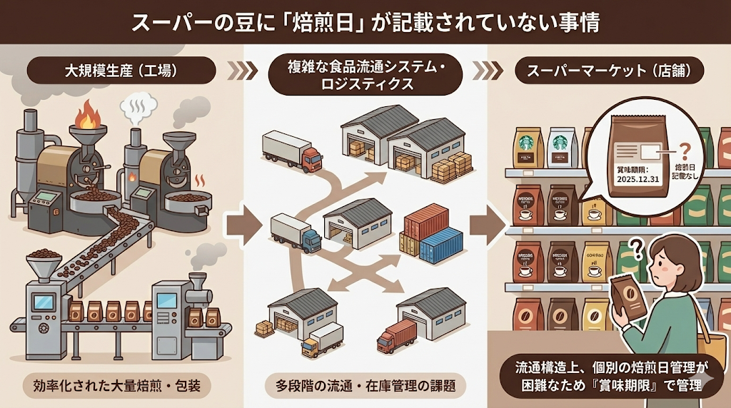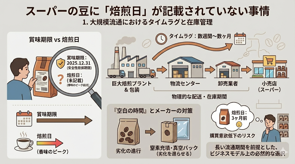 一般的なスーパーマーケットや量販店で販売されている大手メーカーのコーヒー豆には、多くの場合「焙煎日」が記載されていません。これには、日本の食品流通システム特有の構造的な理由と、大規模生産におけるロジスティクスの課題が深く関係しています。