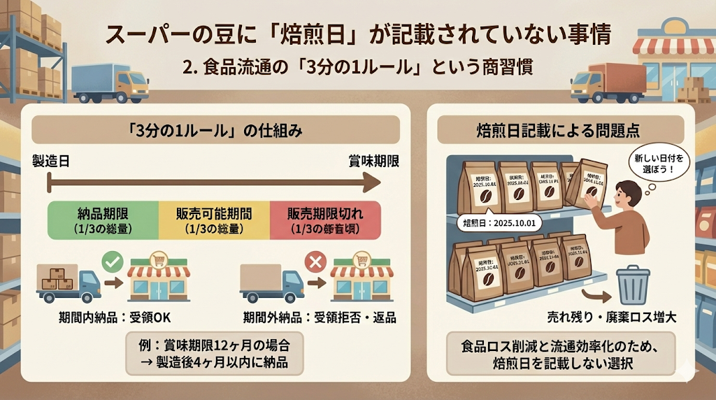 この厳格な納品期限を守るため、メーカーや物流業者は在庫の回転をシビアに管理する必要があります。もしパッケージに「焙煎日」が大きく記載されていれば、消費者は棚の奥から少しでも日付の新しい商品を選ぼうとする心理(先入れ先出しの崩壊)が働き、日付の古い商品が売れ残って廃棄ロスが増大する恐れがあります。スーパーの棚に焙煎日が書かれていない背景には、こうした食品ロス削減と流通効率化という、品質とは別の力学が働いているのです。