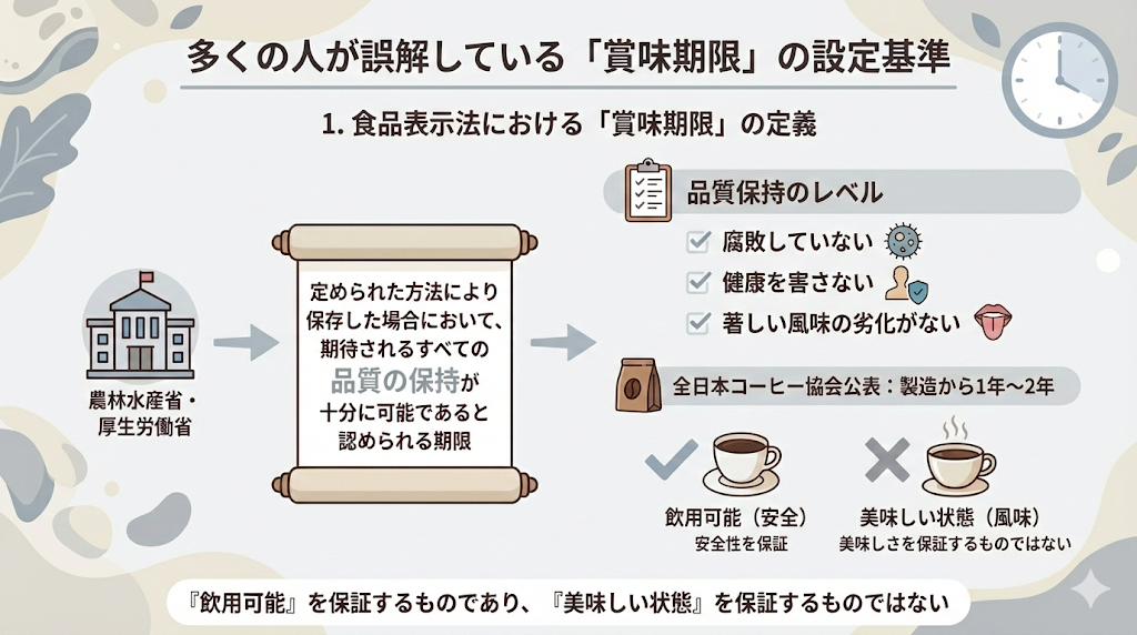 多くの加工食品において、この品質保持期限は「腐敗していない」「健康を害さない」「著しい風味の劣化がない」というレベルで設定されます。全日本コーヒー協会では、未開封のレギュラーコーヒーの賞味期限を「製造から1年〜2年」と公表しています 。これは、微生物的な腐敗リスクが極めて低いコーヒー豆(水分活性が低いため)において、1年後でも「飲用可能である」ということを保証するものであり、「美味しい状態」を保証するものではありません。