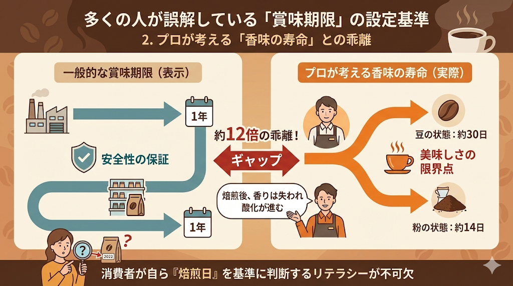 消費者がコーヒーを購入する際、パッケージの裏面にある「賞味期限」を確認することは一般的ですが、「焙煎日(Roast Date)」を確認する習慣はまだ浸透していません。しかし、この二つの日付は全く異なる意味を持っています。「賞味期限」は食品としての安全性を担保する期間であるのに対し、「焙煎日」は香味のピークと寿命を測るための起点です。この違いを理解することが、真の「鮮度」を知る第一歩となります。