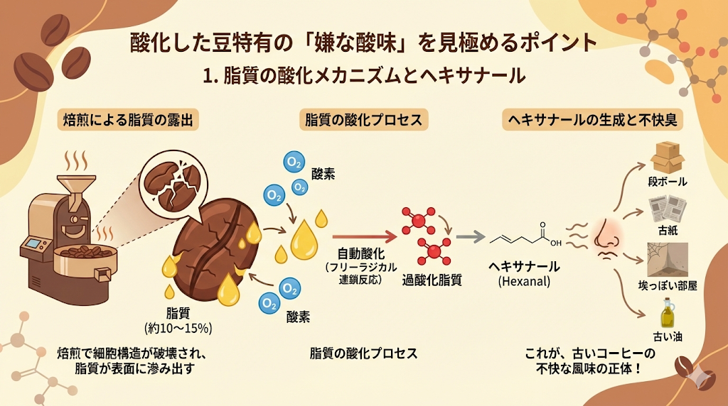 コーヒー豆には約10〜15%の脂質が含まれており、焙煎によって細胞構造が破壊されると、この脂質が表面に滲み出し、酸素と接触します 。脂質の自動酸化プロセスは、フリーラジカルの連鎖反応によって進行し、過酸化脂質を生成します。