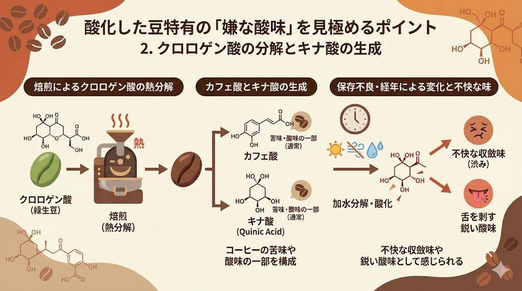コーヒーの酸味成分の一つであるクロロゲン酸は、焙煎過程で熱分解され、カフェ酸やキナ酸(Quinic Acid)に変化します 。キナ酸自体はコーヒーの苦味や酸味の一部を構成する要素ですが、保存状態が悪い場合や焙煎から時間が経ちすぎた場合、加水分解や酸化が進み、不快な収斂味(渋み)や、舌を刺すような鋭い酸味として感じられるようになります。