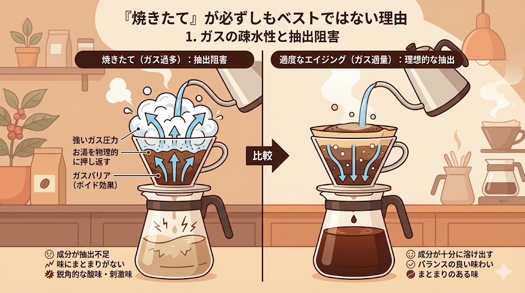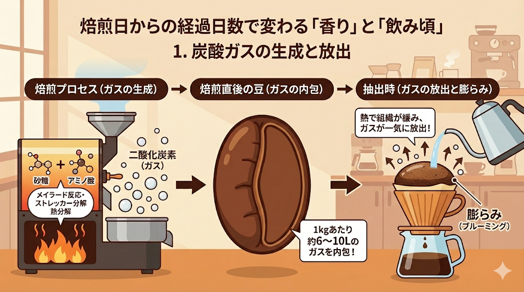 「コーヒーは焙煎したてが一番美味しい」という説は、半分正解で半分間違いです。コーヒー豆は焙煎直後から激しい化学変化を続け、その過程で香味のバランスが整う「エイジング(熟成)」の期間を必要とします。