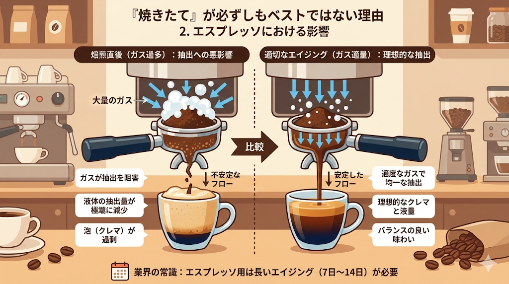 特に圧力をかけて抽出するエスプレッソにおいては、ガスの影響は甚大です。焙煎直後の豆を使用すると、ガスが大量の泡(クレマ)を作り出し、液体の抽出量が極端に減ったり、フロー(抽出流速)が不安定になったりします 。そのため、エスプレッソ用の豆はドリップ用よりも長いエイジング期間(7日〜14日)を取ることが業界の常識となっています。