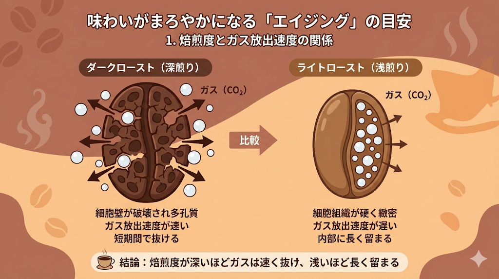 研究によると、焙煎度が深い(ダークロースト)ほど、豆の細胞壁が破壊され多孔質になっているため、ガスの放出速度が速くなります 。逆に、焙煎度が浅い(ライトロースト)ほど、細胞組織が硬く緻密であるため、ガスが内部に長く留まります。