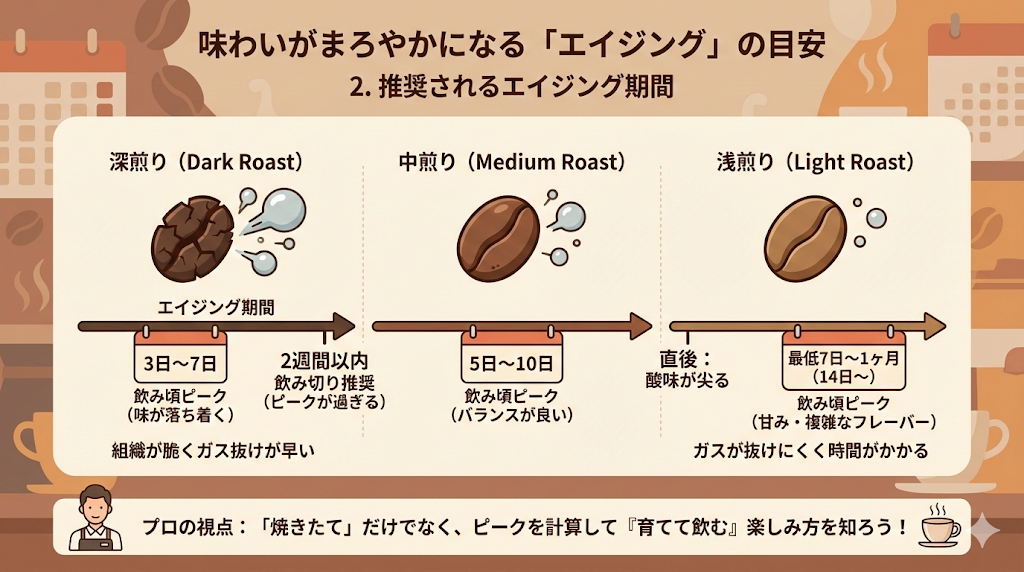 焙煎後の豆からガスが適度に抜け、成分の加水分解やポリマー化などの化学変化が落ち着き、味が最も安定して美味しくなる期間を「エイジング期間」または「飲み頃」と呼びます。この期間は、焙煎度合い(ローストレベル)によって大きく異なります。