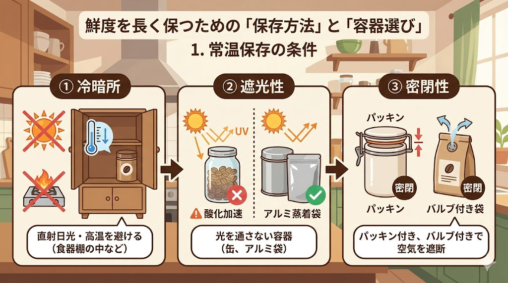 日常的にコーヒーを消費し、焙煎日から2週間〜3週間程度で飲みきれる量であれば、常温保存が最も手軽でリスクの少ない方法です。