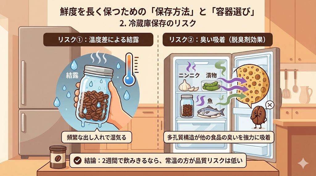 多くの人が良かれと思って行う「冷蔵庫保存」ですが、頻繁に出し入れする常用豆には不向きです。冷蔵庫内は乾燥していますが、出し入れの際の温度差で結露が発生しやすく、またコーヒー豆の多孔質構造が冷蔵庫内の他の食品の臭い(ニンニクや漬物など)を強力に吸着してしまう「脱臭剤効果」が働くためです 。2週間で飲みきるなら、常温の方が品質リスクは低いです。