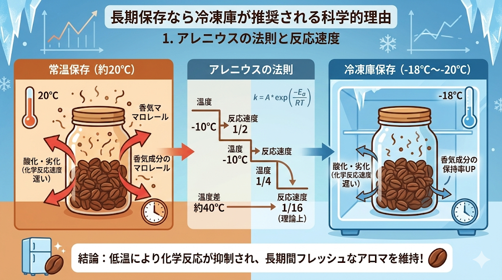 化学反応の速度は温度に依存します(アレニウスの法則)。一般的な目安として、温度が10℃下がると化学反応の速度は約半分になると言われています。冷凍庫(-18℃〜-20℃)での保存は、常温(20℃)に比べて約40℃低い環境であり、理論上、酸化や劣化のスピードを1/16程度まで遅らせることが期待できます 。 研究においても、冷凍保存は常温保存に比べて香気成分(揮発性化合物)の保持率が高く、長期間フレッシュなアロマを維持できることが実証されています。