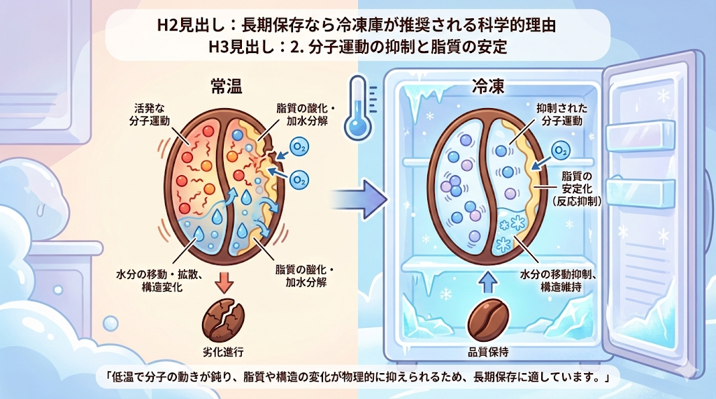 冷凍温度帯では、分子の運動エネルギーが低下し、脂質の酸化反応や加水分解といった劣化プロセスが物理的に進行しにくくなります 。また、水分の移動や拡散も抑制されるため、豆の構造変化も最小限に抑えられます。