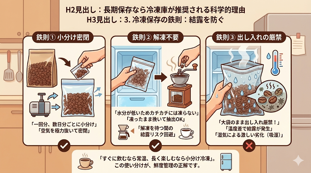 - 出し入れの厳禁: 大きな袋のまま冷凍し、使うたびに袋ごと出し入れすると、その都度、外気との温度差で豆の表面に結露が生じ、湿気による激しい劣化(吸湿)を招きます。