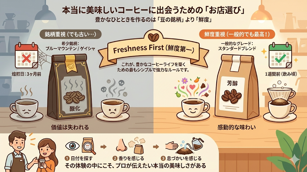 美味しいコーヒーを手に入れるためには、豆の知識だけでなく、信頼できる供給者(ロースター)を見極める眼を持つことが重要です。お店の形態や情報の開示姿勢には、その店の「鮮度」に対する哲学が表れます。