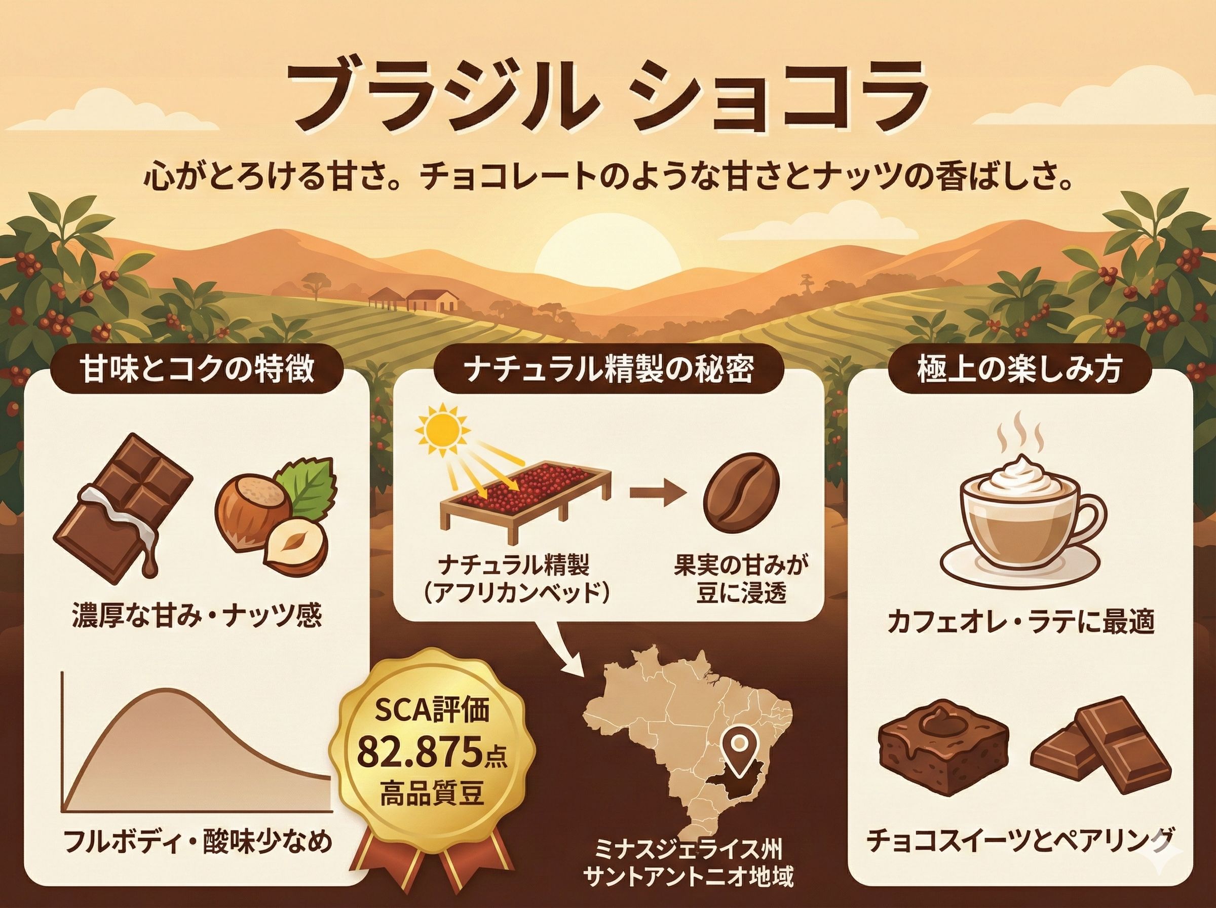 そんなコーヒー大国ブラジルが誇る銘柄の中でも、特に濃厚で甘い風味を持つことで知られているのが、この「ブラジルショコラ」です。